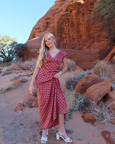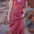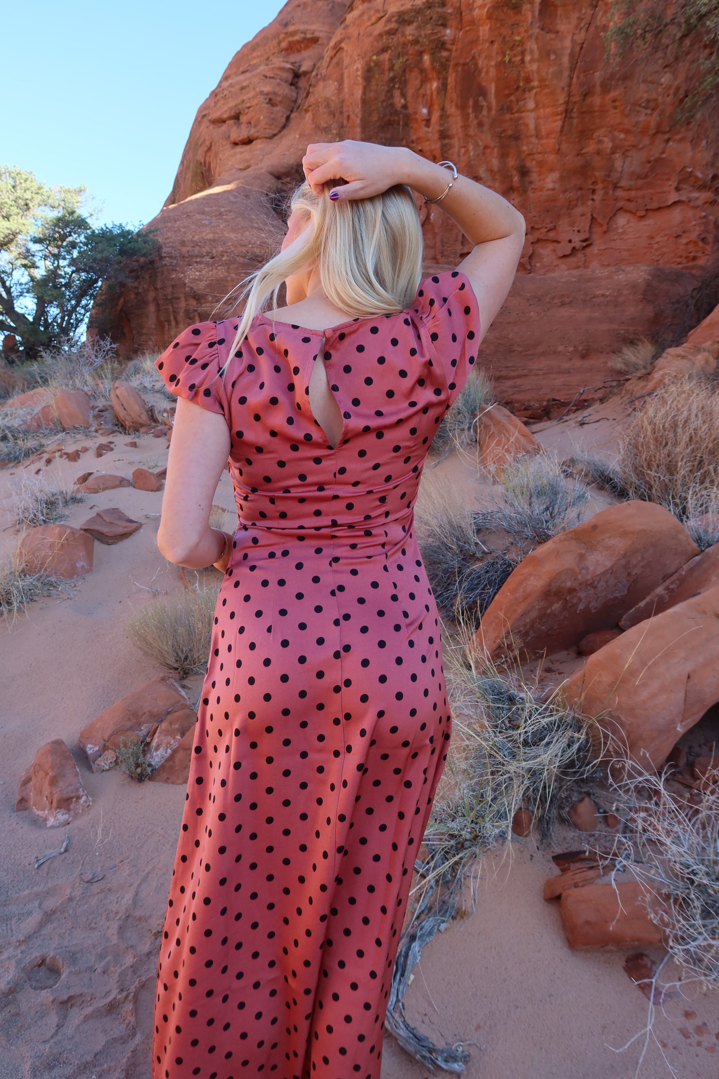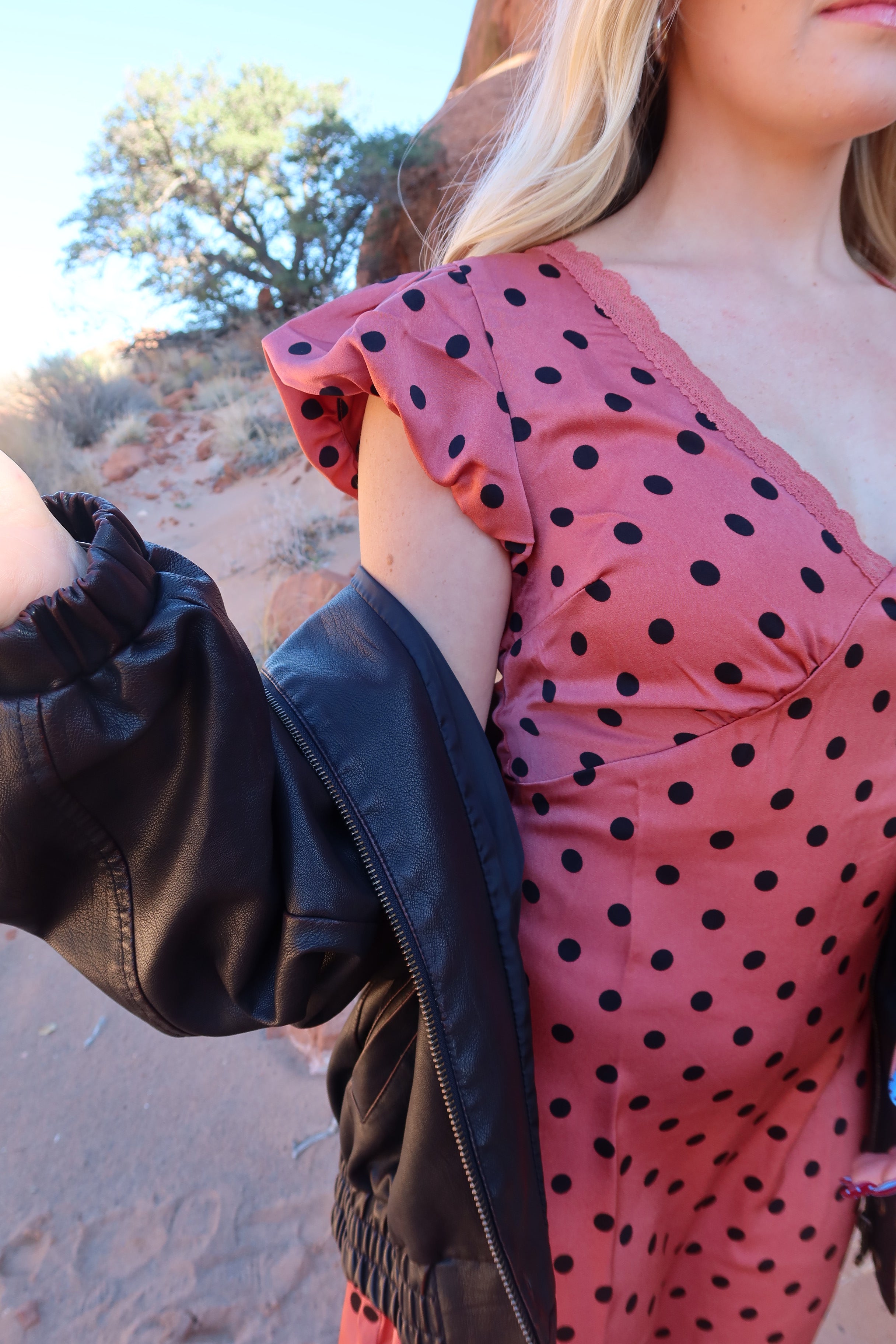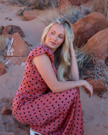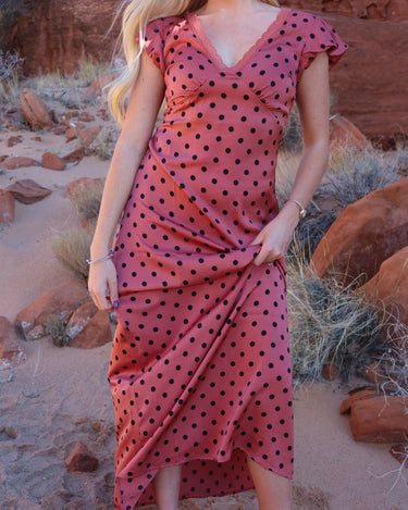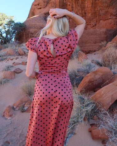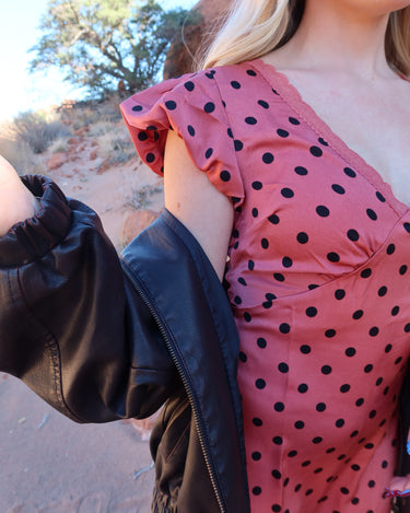 -Dusty red color with black polka dots