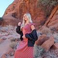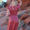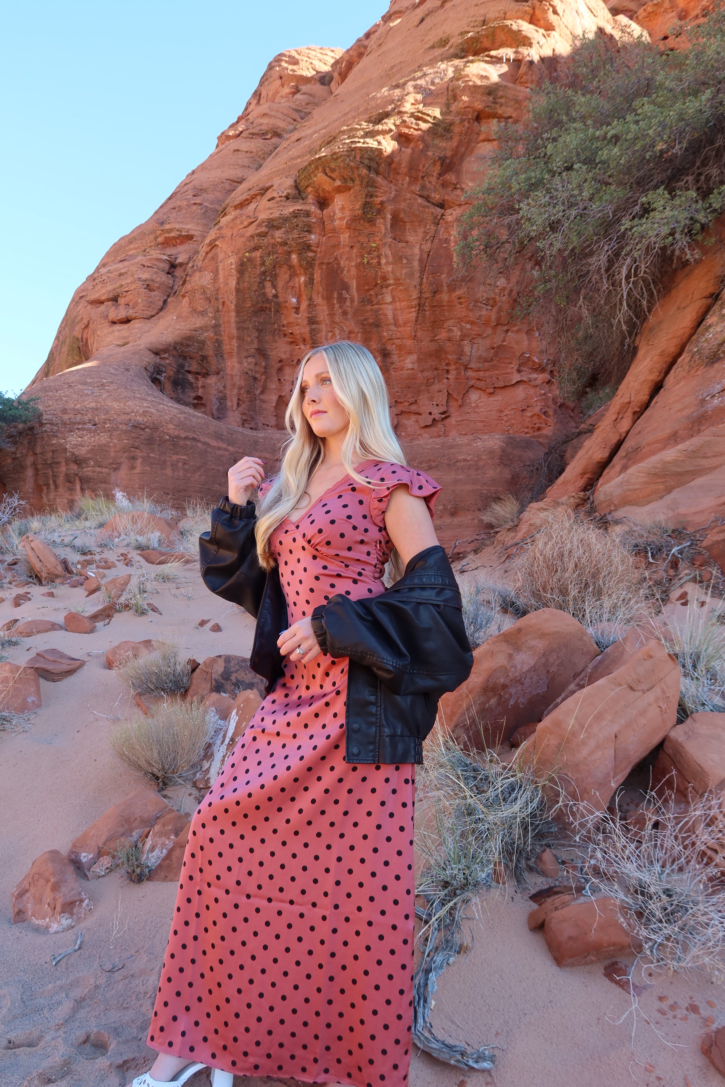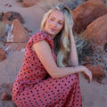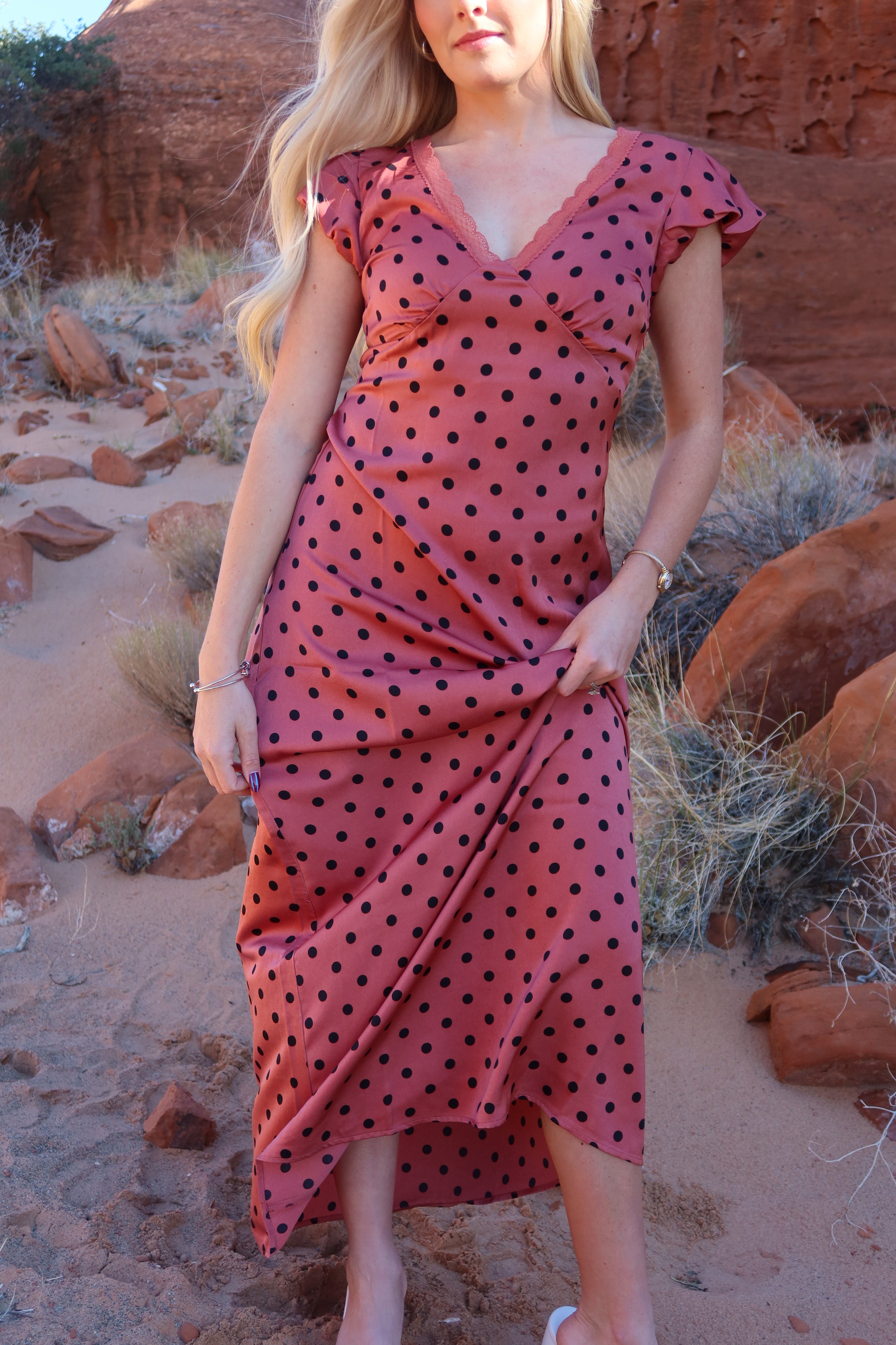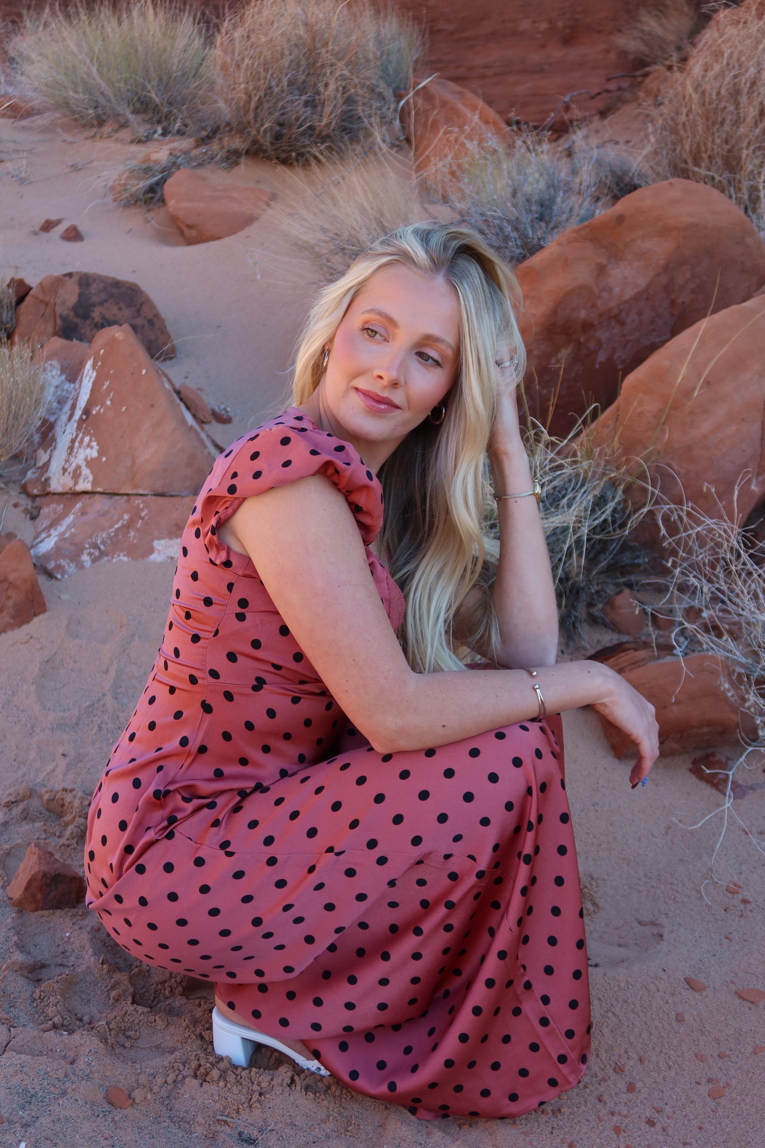 -Dusty red color with black polka dots