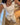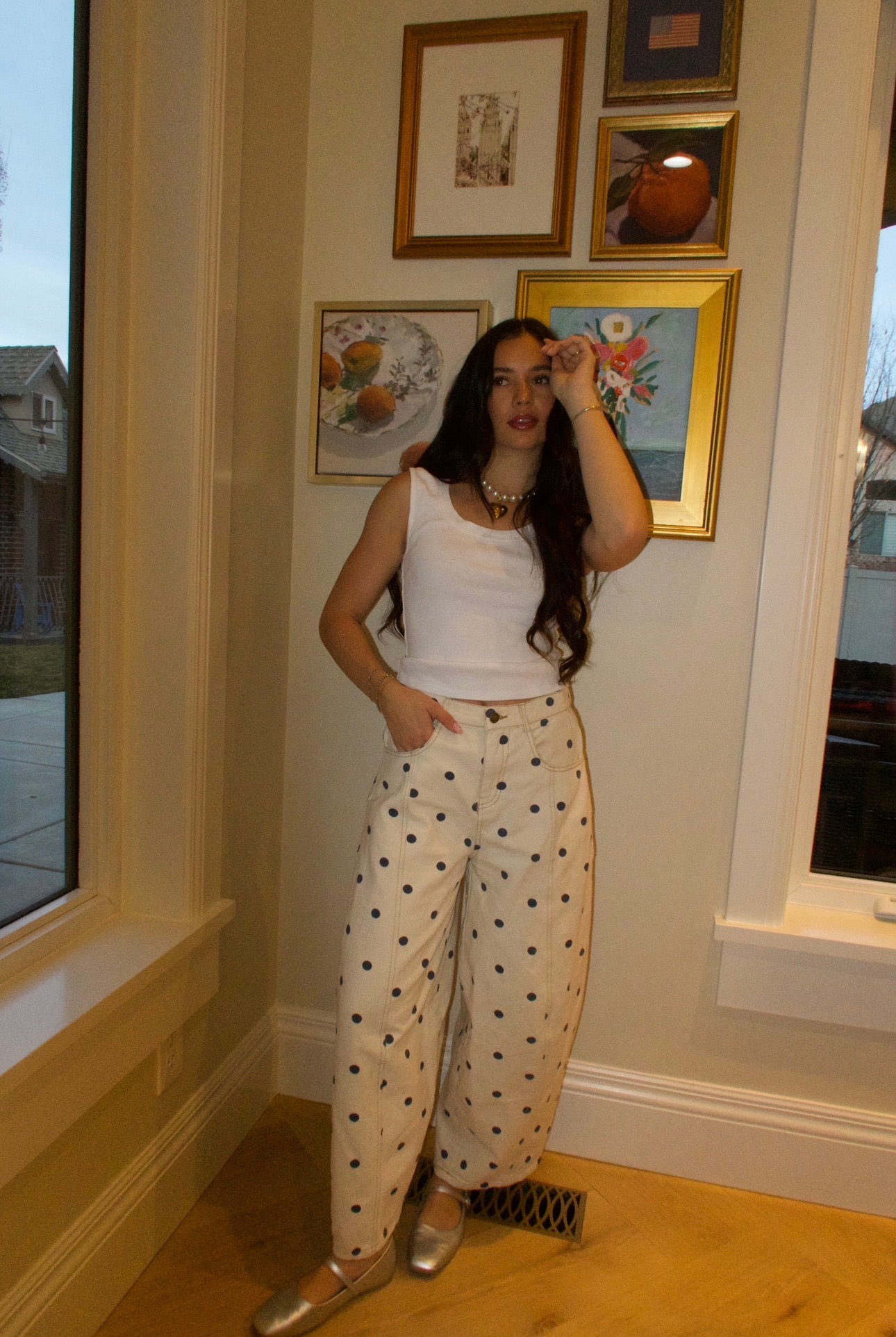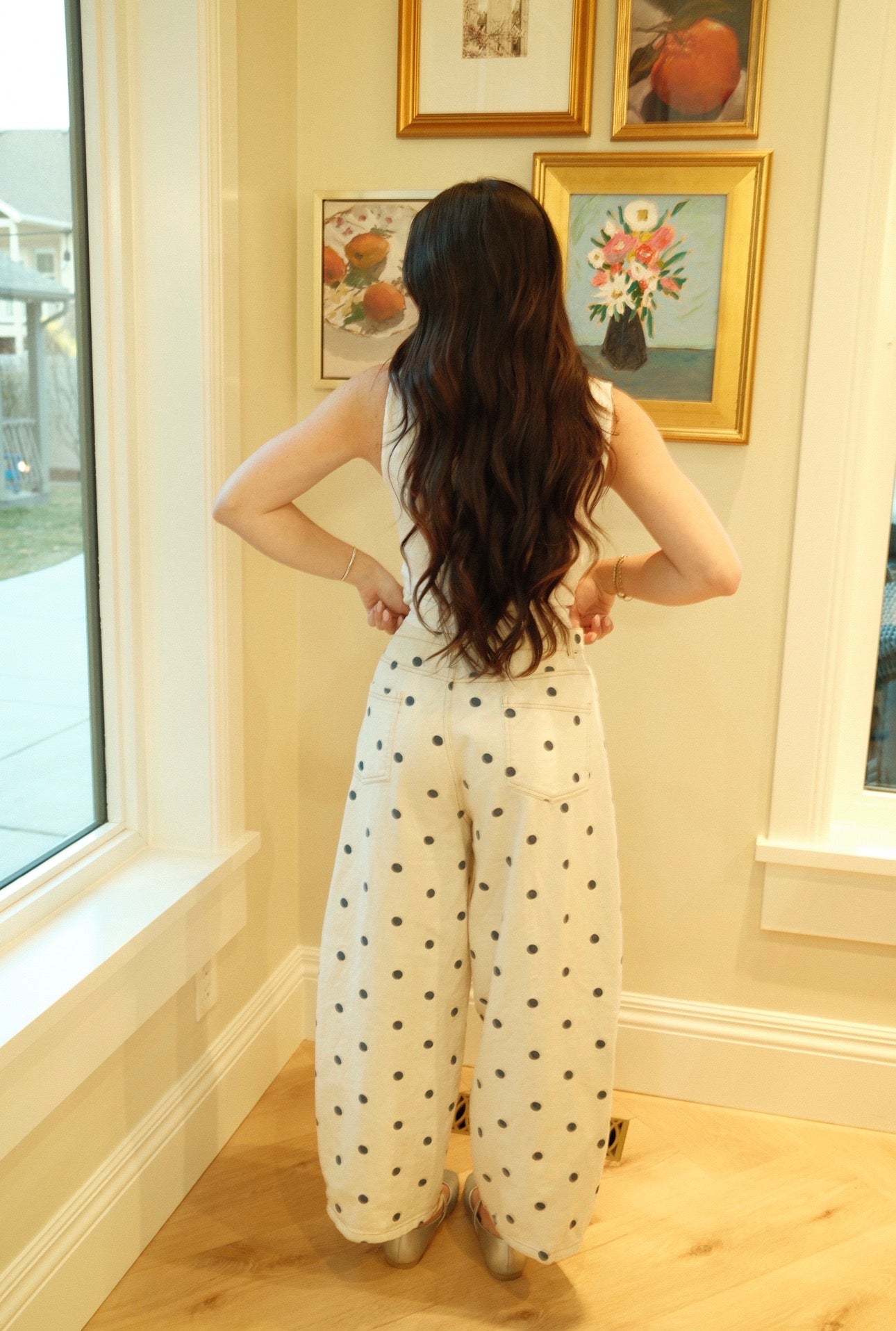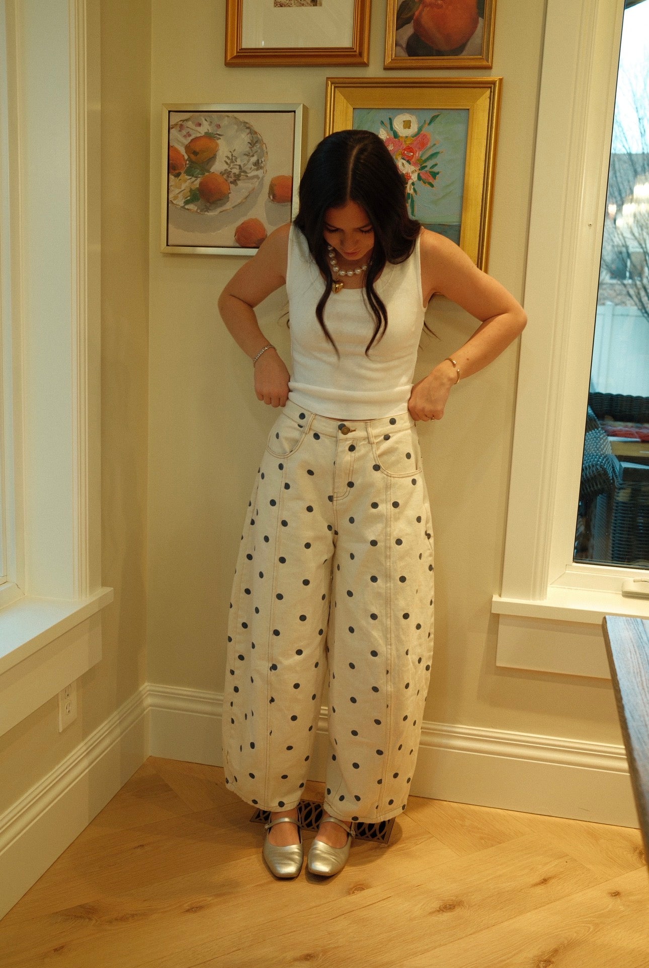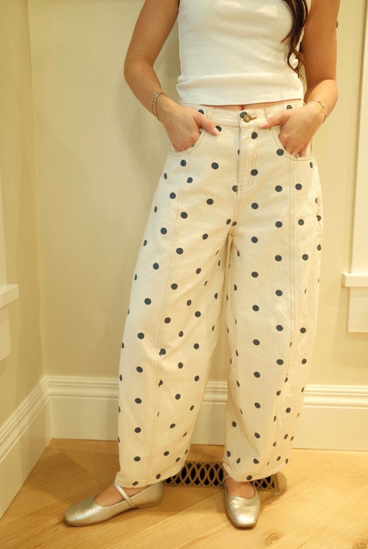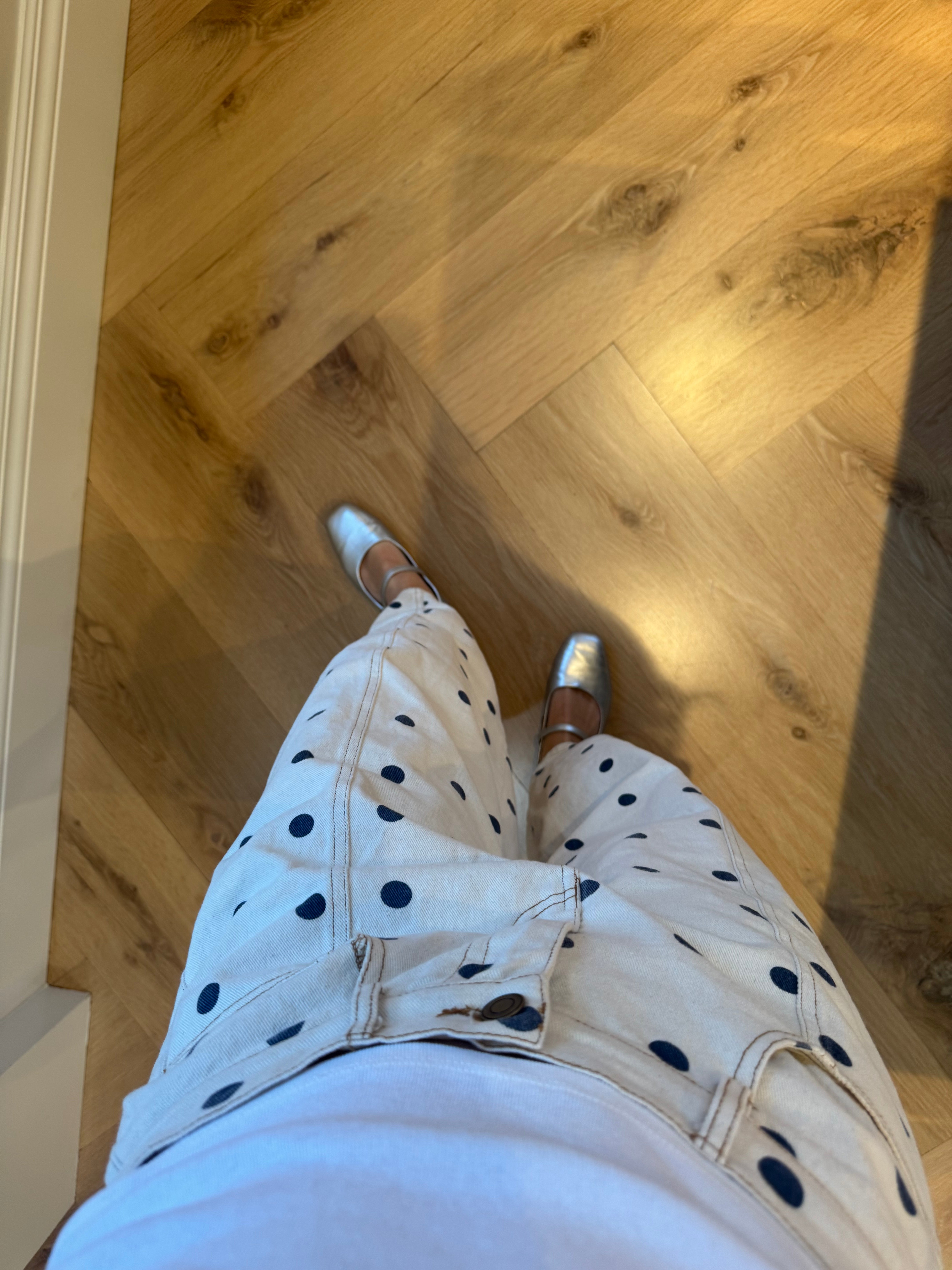 -Creamy color with navy polkadots